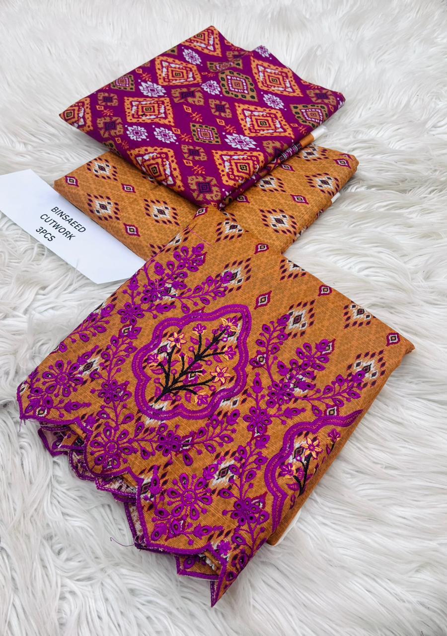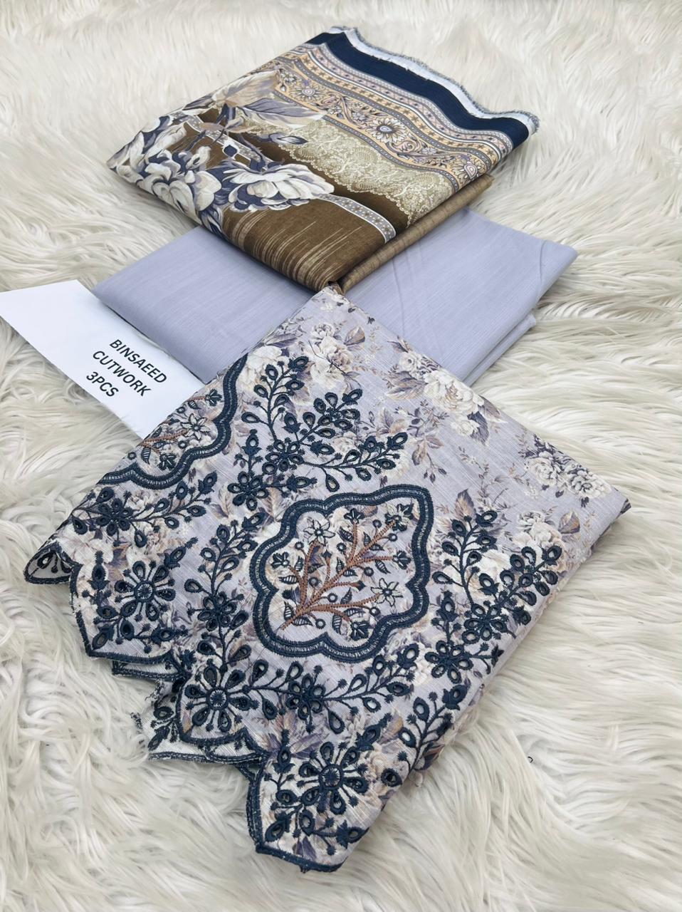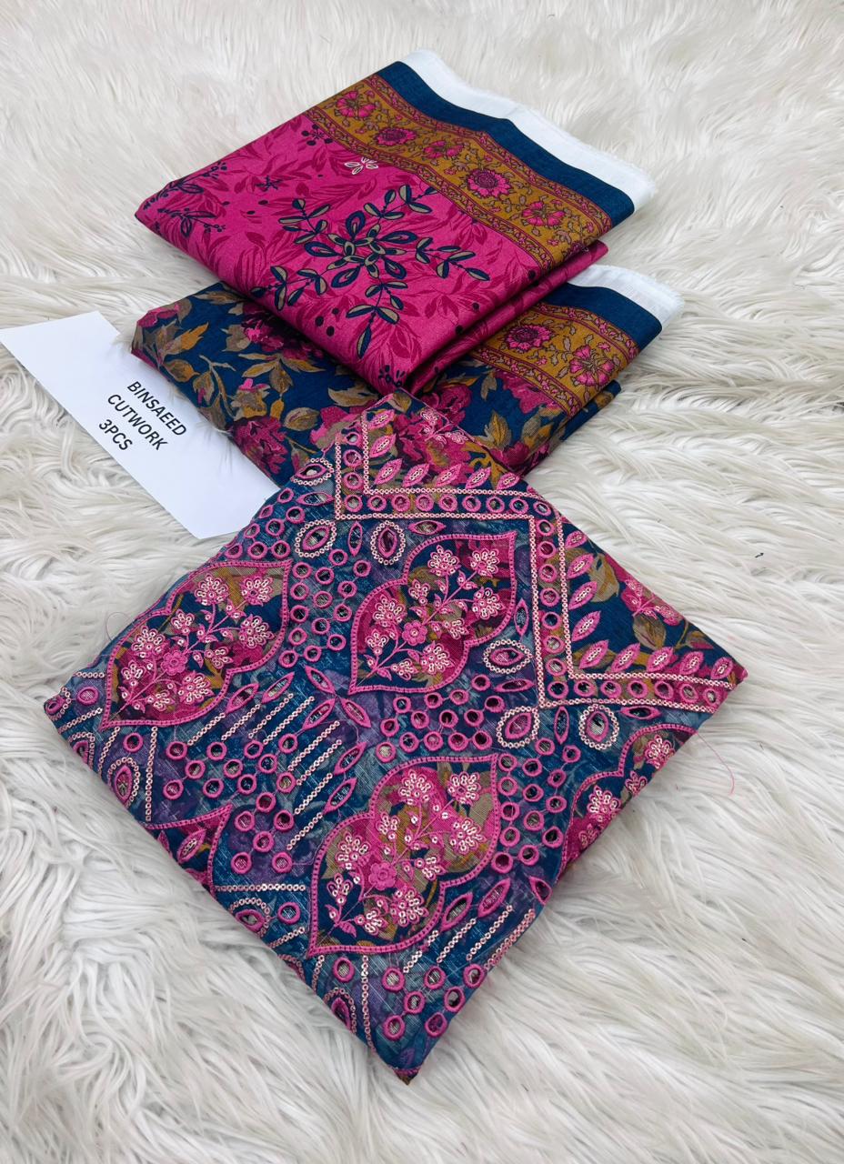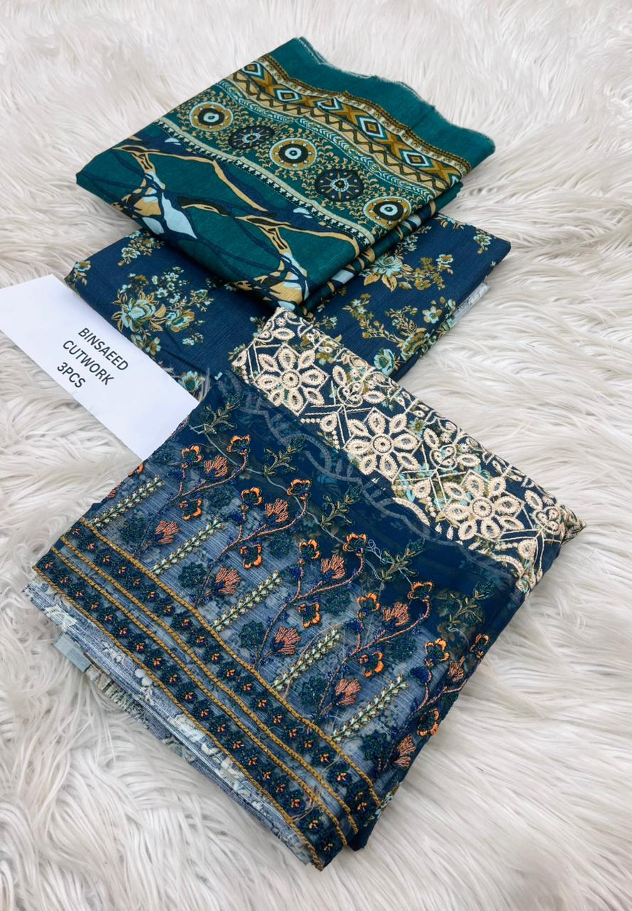 ORIGNAIL STOCK . BIN SAEED . PURE KHADAR COLLECTION 3PCS . GIGITAL EMB DESIGN . STUFF . BEST QUALITY PURE EMB KHADAR .. PRINTED KHADAR EMB SHIRT . PRINTED KHADAR DUPATTA . PRINTED KHADAR TROUSER AN DYED . BRAND STEMP ON FEBRIC .