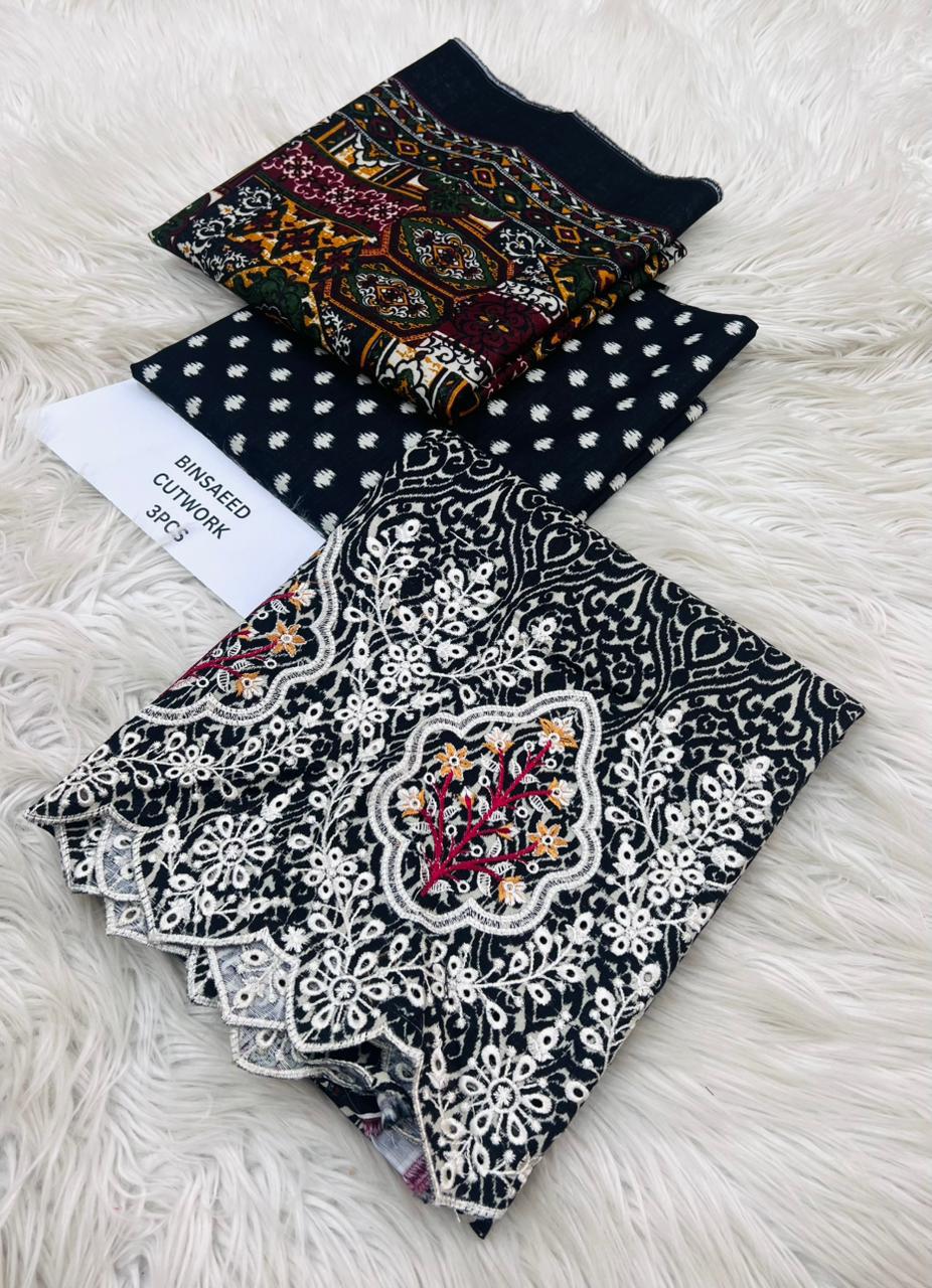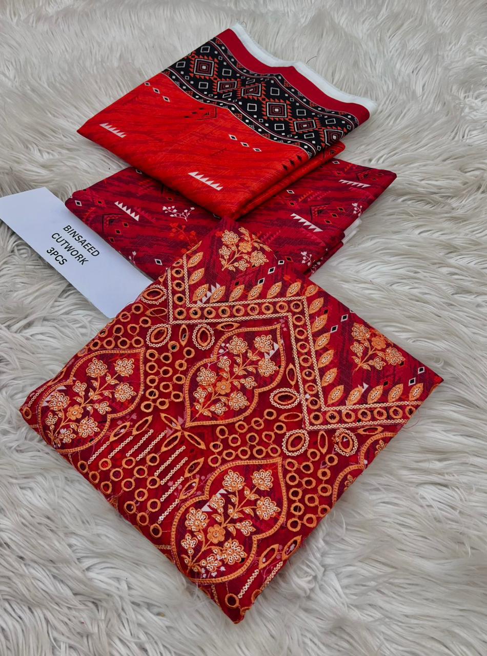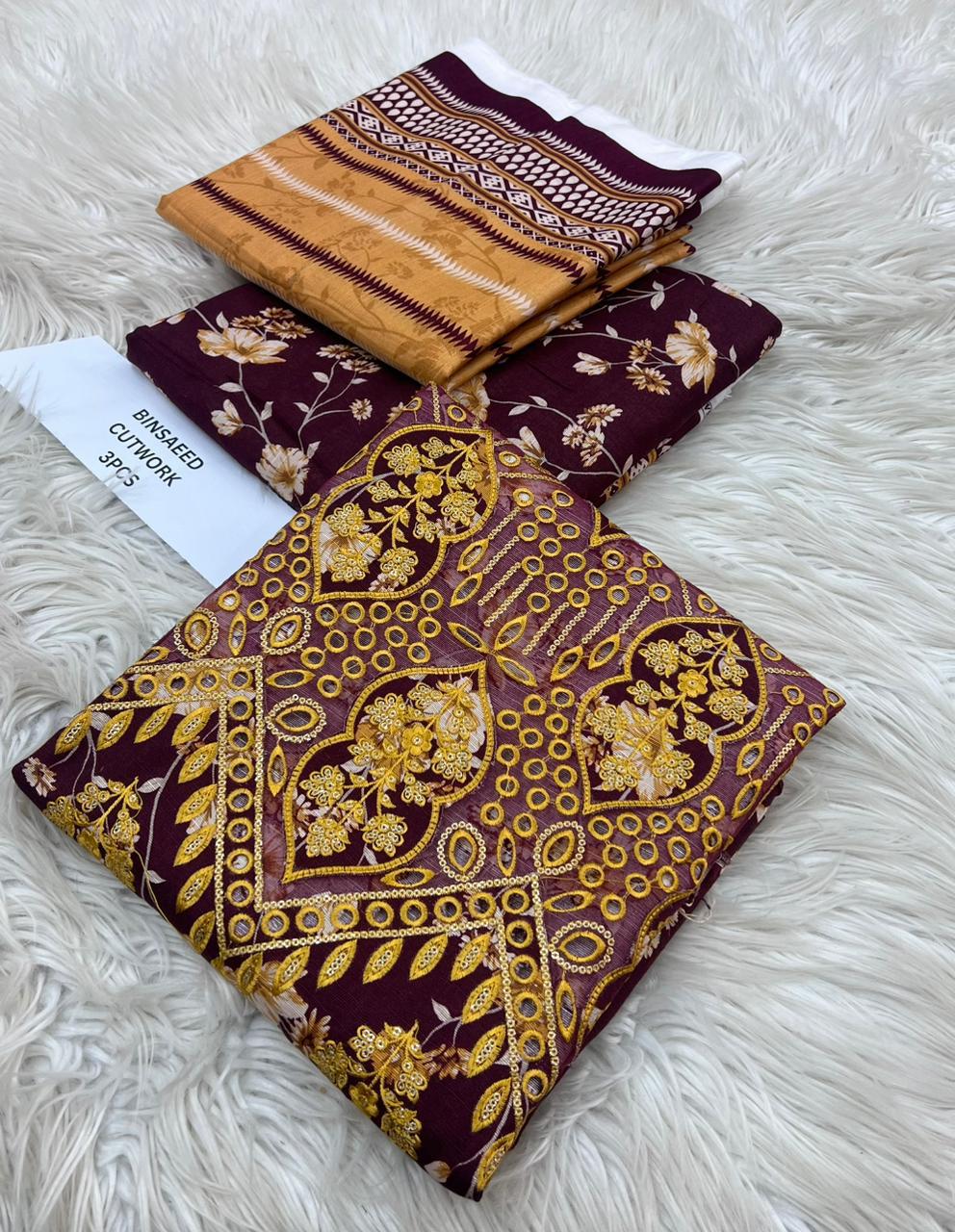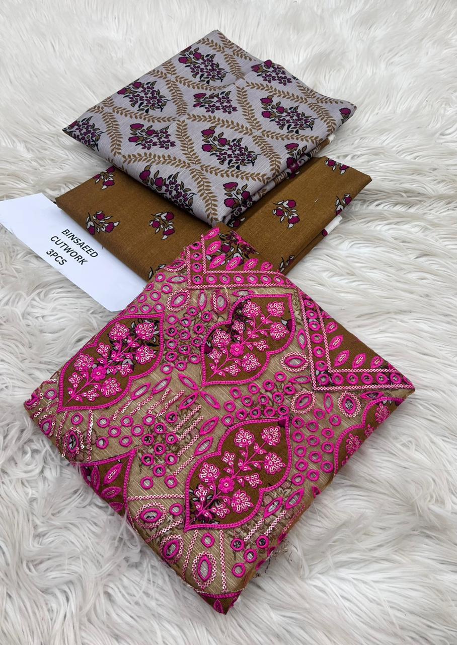 ORIGNAIL STOCK . BIN SAEED . PURE KHADAR COLLECTION 3PCS . GIGITAL EMB DESIGN . STUFF . BEST QUALITY PURE EMB KHADAR .. PRINTED KHADAR EMB SHIRT . PRINTED KHADAR DUPATTA . PRINTED KHADAR TROUSER AN DYED . BRAND STEMP ON FEBRIC .