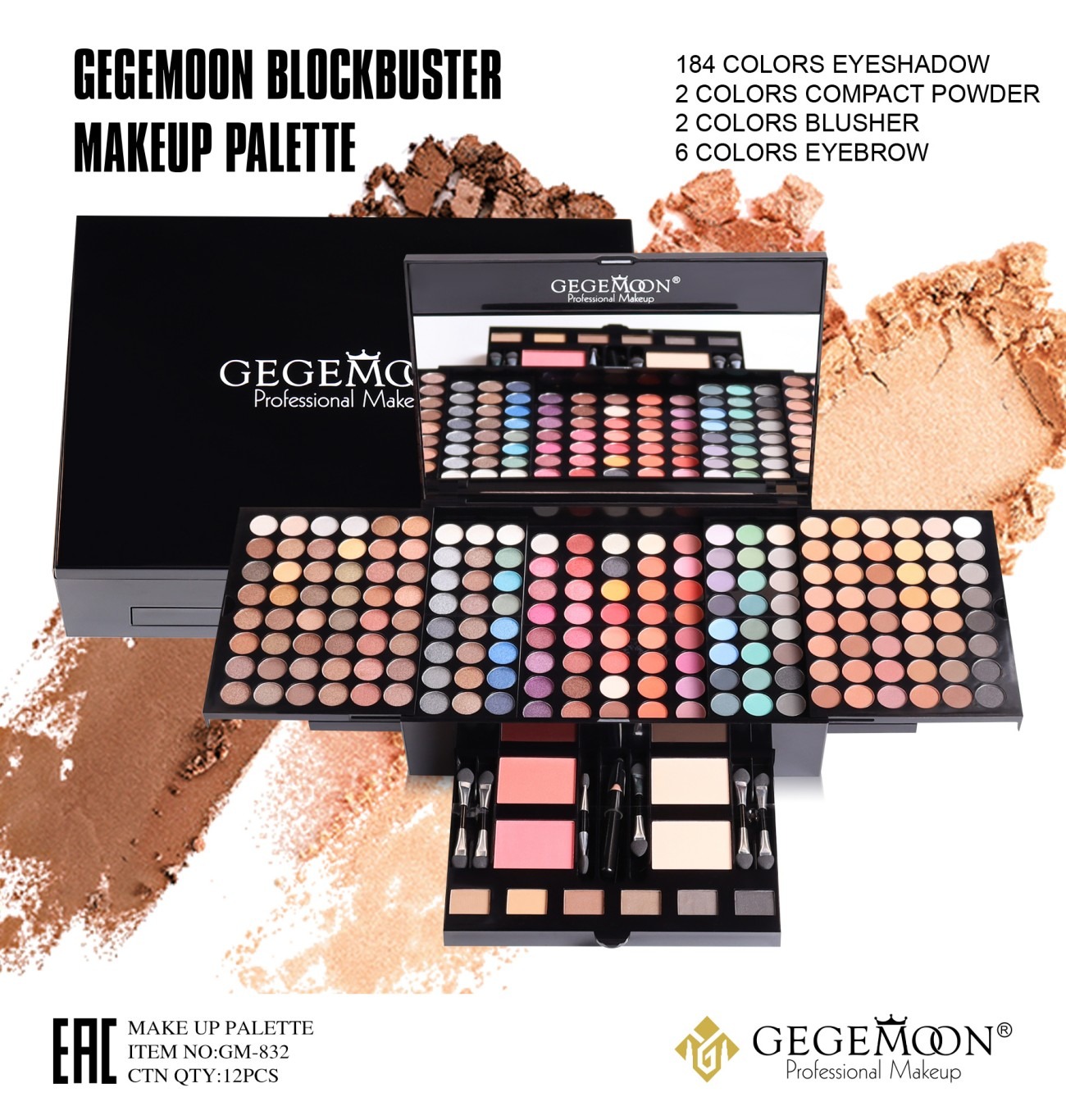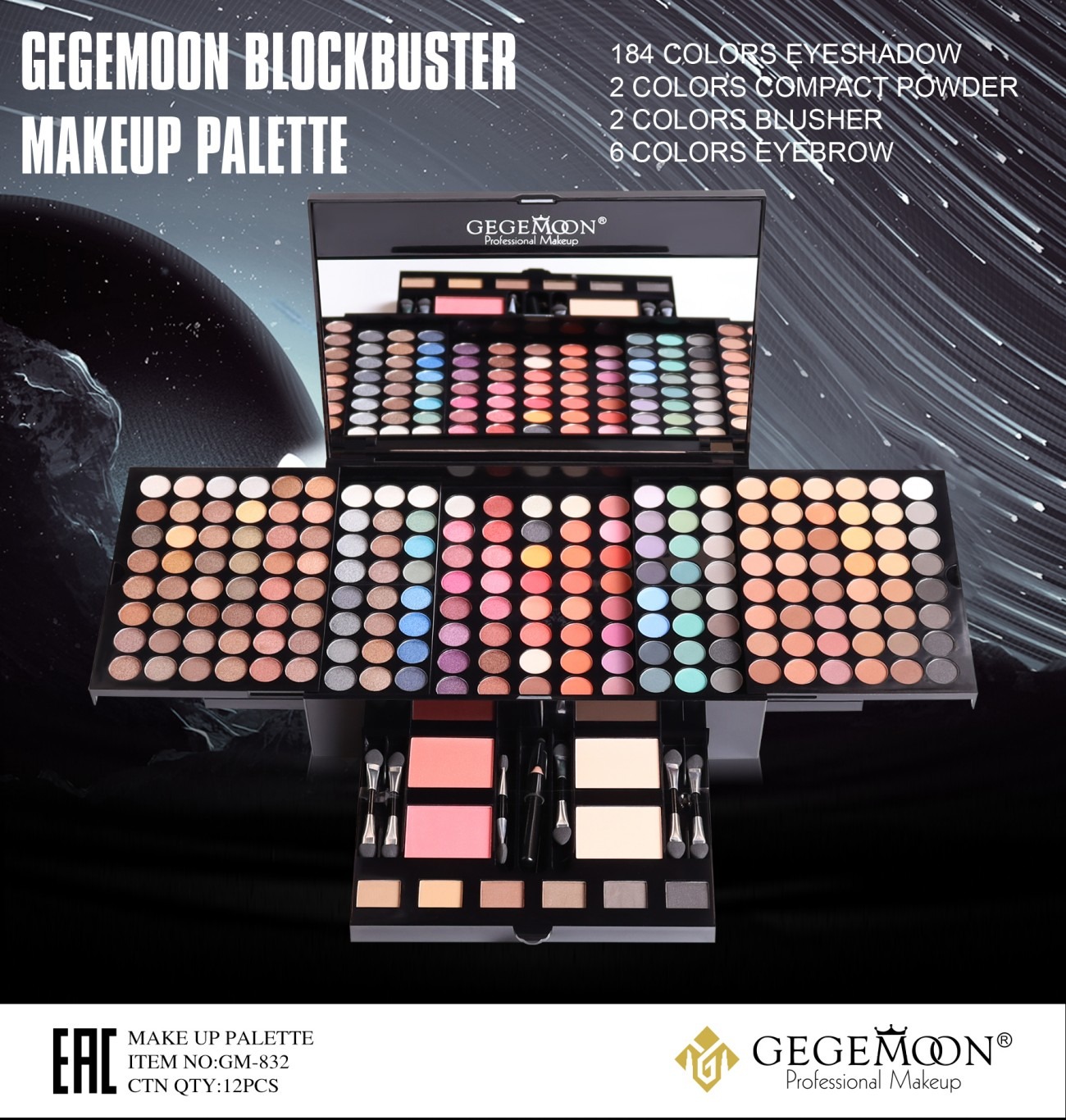 GEGEMOON BLOCKBUSTER MAKEUP PALETTE . 184 COLORS EYESHADOW . 2 COLORS COMPACT POWDER . 2 COLORS BLUSHER . 6 COLORS EYEBROW COMPLETE MAKEUP KIT .