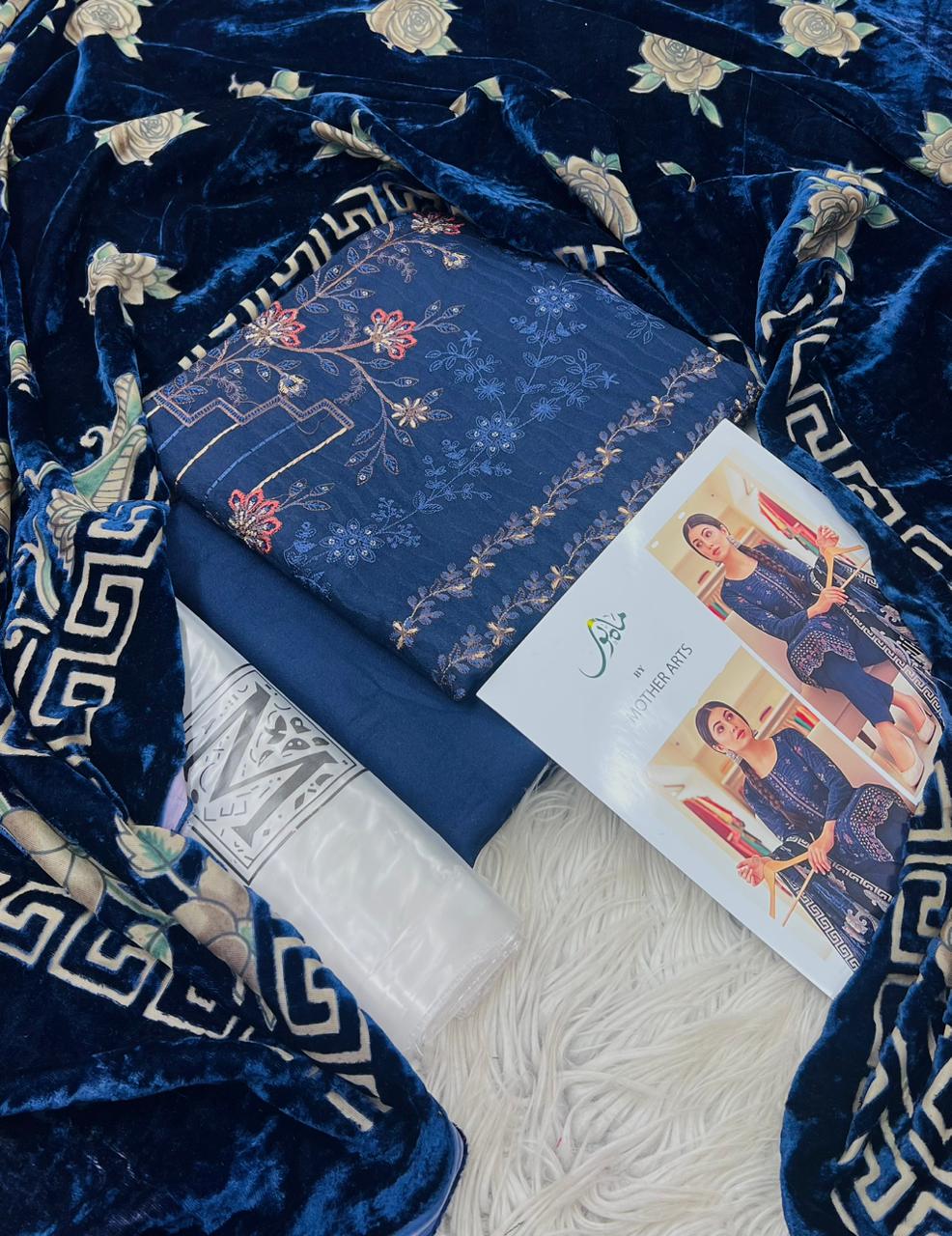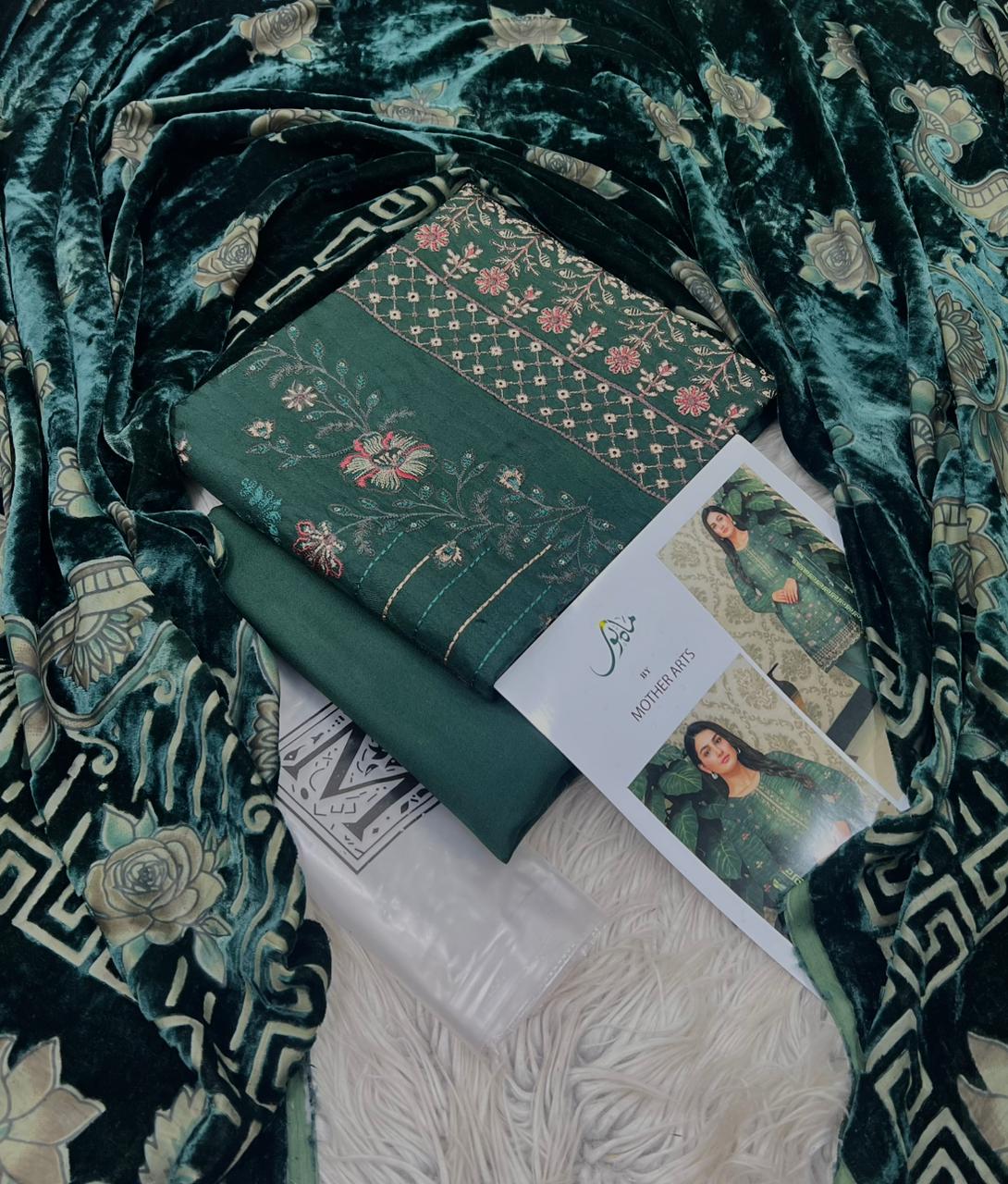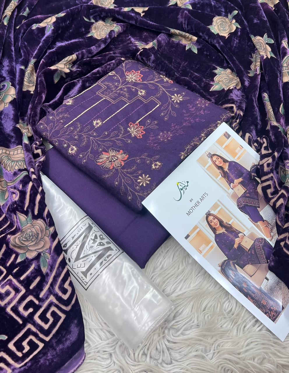 MAHNOOR , PURE DHANAK COLLECTION 3PCS , DIGITAL EMB DESIGN , STUFF , BEST QUALITY PURE DHANAK , DHANAK EMBROIDRED 2 HEAD SHIRT , BACK AND SLEVEES EMBROIDRED , VELVAT PLACHI SHAWAL , DYED TROUSER , BRAND STEM ON FEBRIC , AFTER WASH GURANTEED , ORIGINAL SUITS