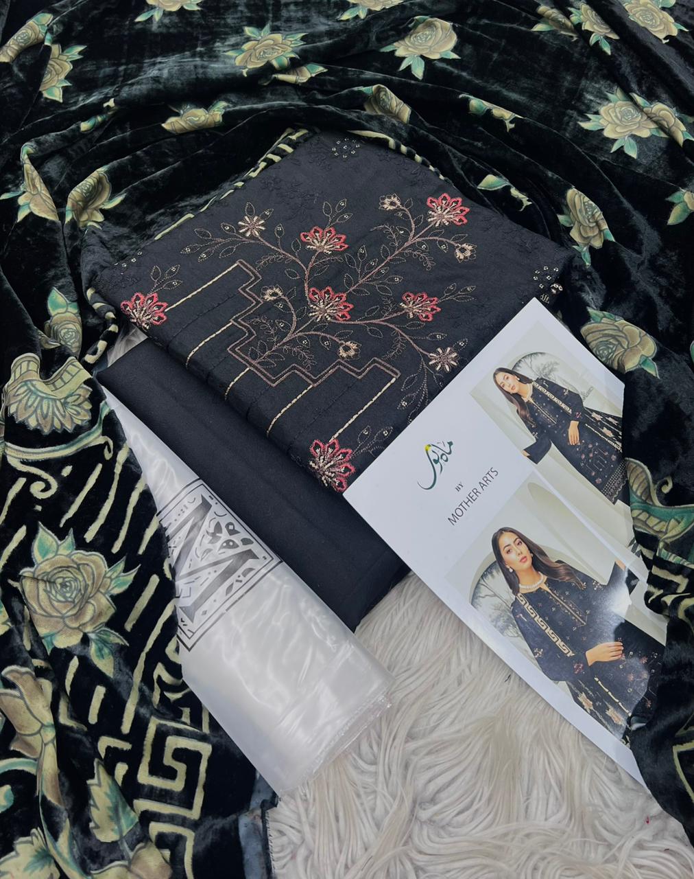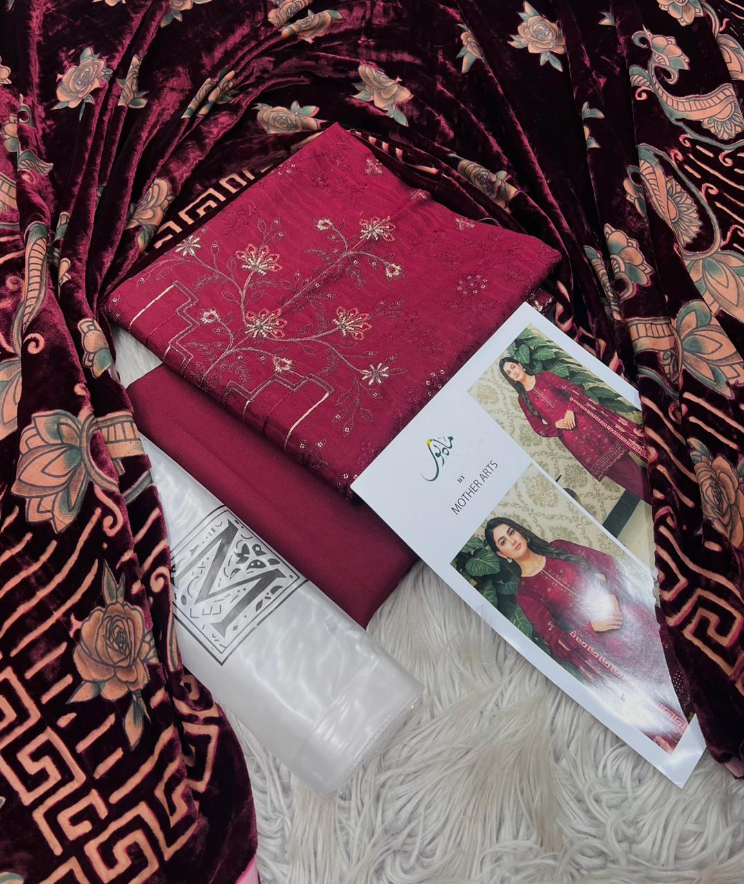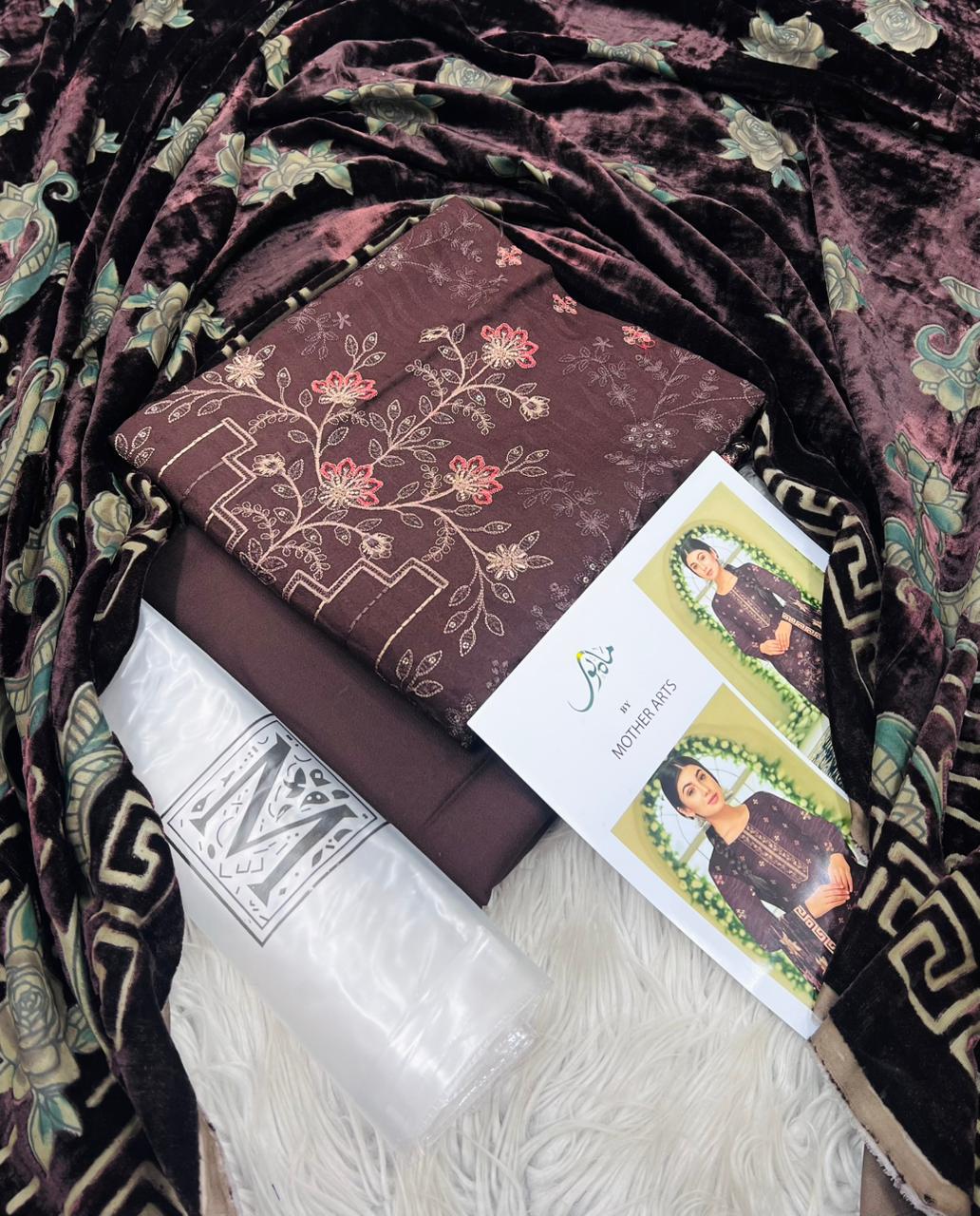 MAHNOOR , PURE DHANAK COLLECTION 3PCS , DIGITAL EMB DESIGN , STUFF , BEST QUALITY PURE DHANAK , DHANAK EMBROIDRED 2 HEAD SHIRT , BACK AND SLEVEES EMBROIDRED , VELVAT PLACHI SHAWAL , DYED TROUSER , BRAND STEM ON FEBRIC , AFTER WASH GURANTEED , ORIGINAL SUITS
