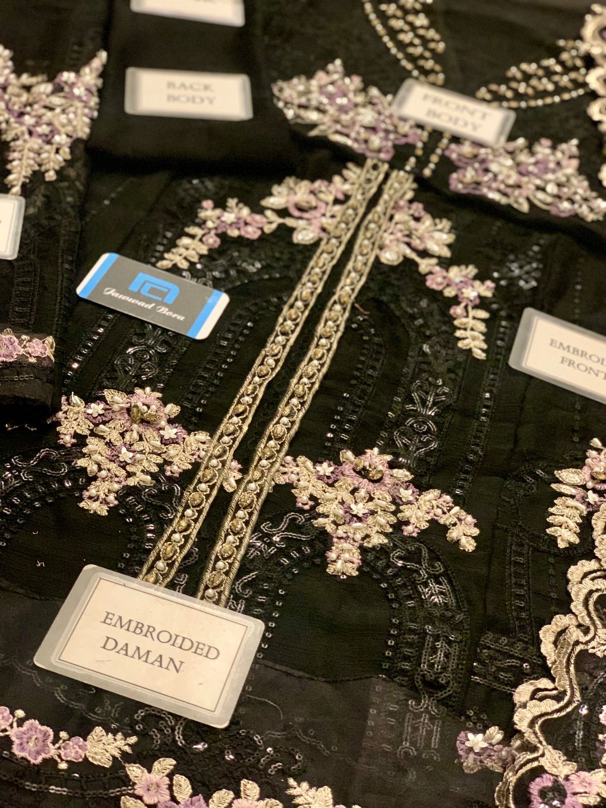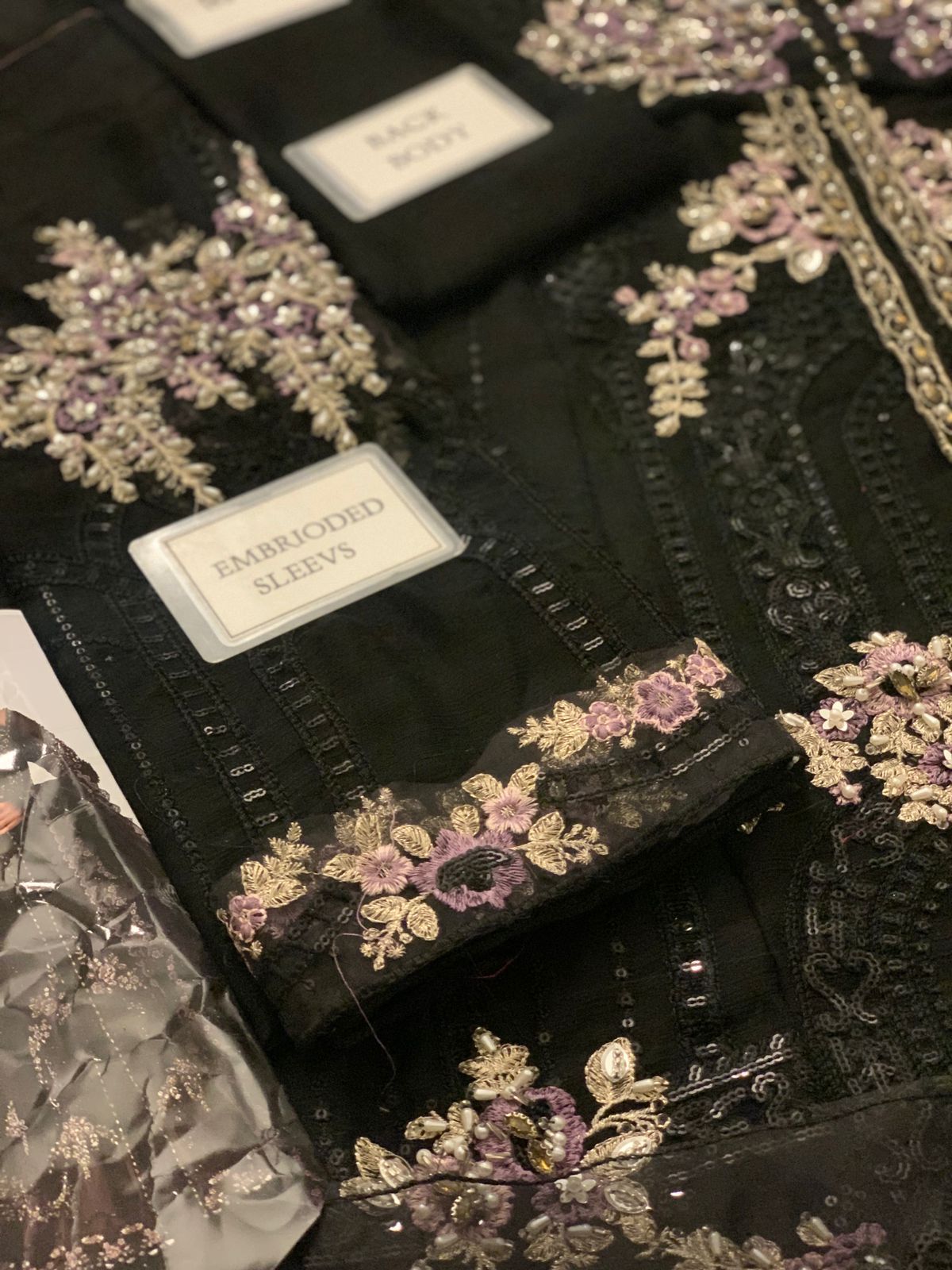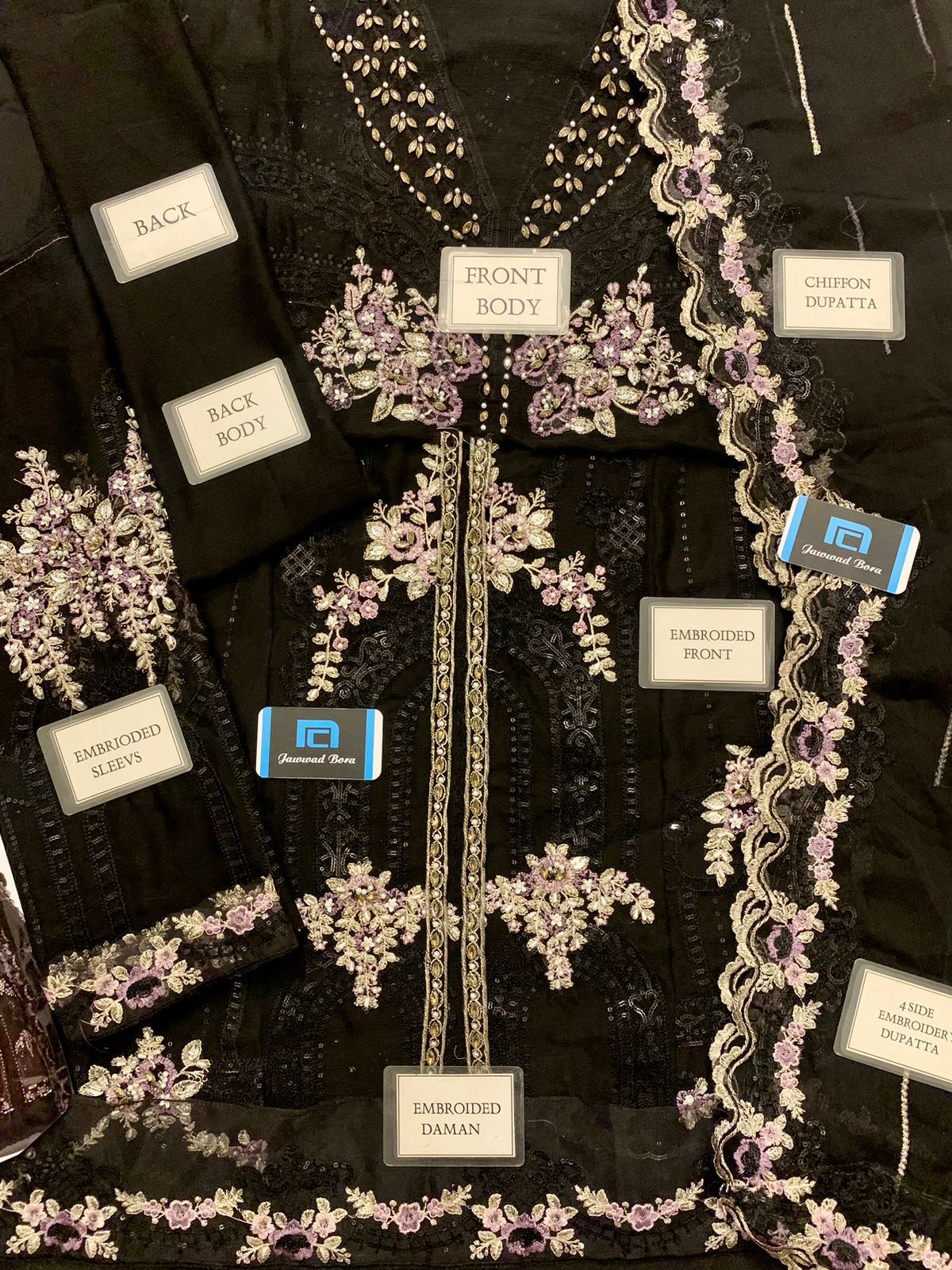 MARIA B CHIFFON COLLECTION . NEW CATLOG . MOST HIT DESIGN . ARTICAL #MBC -3004 -24 . CHIFFON FULLY HEAVY ALTERNET EMBROIDERED SPENGLE WORK FRONT BODY WITH FULLY EMBLISHMENT ADHA WORK . PLAIN CHIFFON BACK BODY CHIFFON FULLY HEAVY ALTERNET EMBROIDERED SPENGLE WORK SLEEVES WITH HAND EMBLISHMENT ADHA WORK SLEEVES BOARDER . CHIFFON FULLY EMBROIDERED SPENGLE WORL FROUK CENTER PANEL WITH FULLY HAND EMBLISHMENT ADHA WORK WITH WITH FULLY HAND EMBLISHMENT CENTER LACE WITH HEAVY EMBLISHMENT SPENGLE WORK 6 LALLI ATTCH WITH FULLY HAND EMBLISHMENT ADHA WORK WITH HEAVY EMBLISHMENT SPENGLE WORK DAMAN BORDERD .PLAIN CHIFFON BACK FROCK CHIFFON FULLY EMBLISHMENT SPENGLE WORK DUPATTA WITH FULLY HEAVY 4 SIDE EMBLISHMENT SPENGLE WORK BORDER ATTACH DYED SATAN SILK TROUSER .