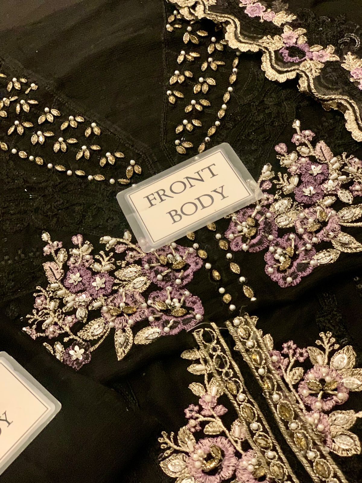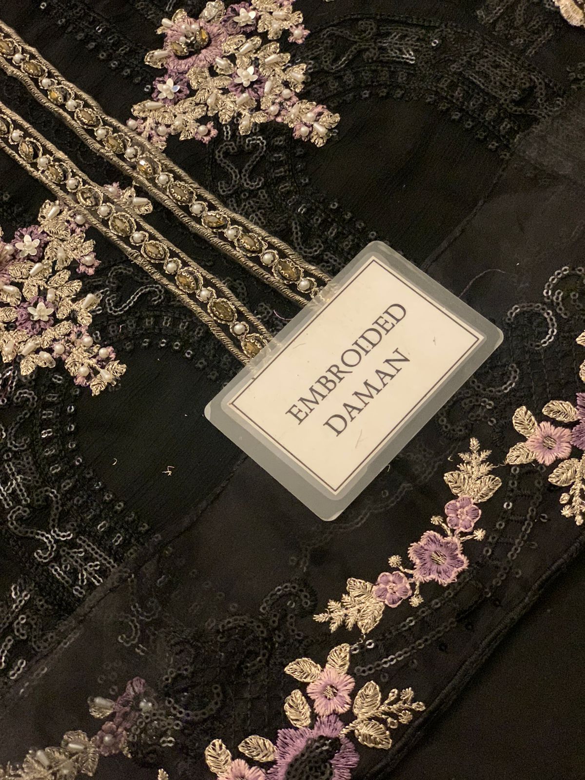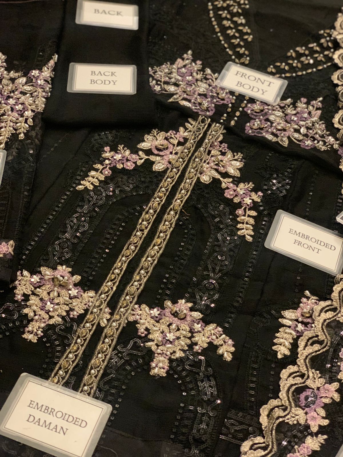 MARIA B CHIFFON COLLECTION . NEW CATLOG . MOST HIT DESIGN . ARTICAL #MBC -3004 -24 . CHIFFON FULLY HEAVY ALTERNET EMBROIDERED SPENGLE WORK FRONT BODY WITH FULLY EMBLISHMENT ADHA WORK . PLAIN CHIFFON BACK BODY CHIFFON FULLY HEAVY ALTERNET EMBROIDERED SPENGLE WORK SLEEVES WITH HAND EMBLISHMENT ADHA WORK SLEEVES BOARDER . CHIFFON FULLY EMBROIDERED SPENGLE WORL FROUK CENTER PANEL WITH FULLY HAND EMBLISHMENT ADHA WORK WITH WITH FULLY HAND EMBLISHMENT CENTER LACE WITH HEAVY EMBLISHMENT SPENGLE WORK 6 LALLI ATTCH WITH FULLY HAND EMBLISHMENT ADHA WORK WITH HEAVY EMBLISHMENT SPENGLE WORK DAMAN BORDERD .PLAIN CHIFFON BACK FROCK CHIFFON FULLY EMBLISHMENT SPENGLE WORK DUPATTA WITH FULLY HEAVY 4 SIDE EMBLISHMENT SPENGLE WORK BORDER ATTACH DYED SATAN SILK TROUSER .
