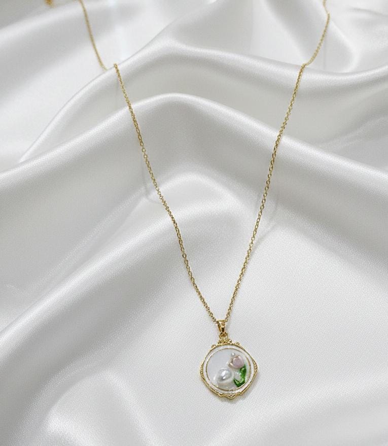 RETRO LUXURY ENAMEL OIL PAINTING PEARL WOMENS NECKLACE PENDANT UNIQUE DESIGN TITANIUM STEEL CLAVICLE CHAIN VIOLET FLOWER GEO